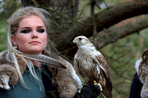 Mette i falkoner-vikingedragt med sakerfalk. -Den 16. november er også den dag, hvor falkejagt blev optaget på UNESCO