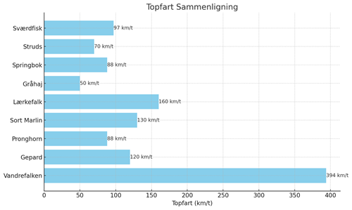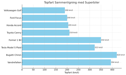 Her er et diagram, der sammenligner topfart mellem vandrefalken og en række superbiler samt almindelige biler