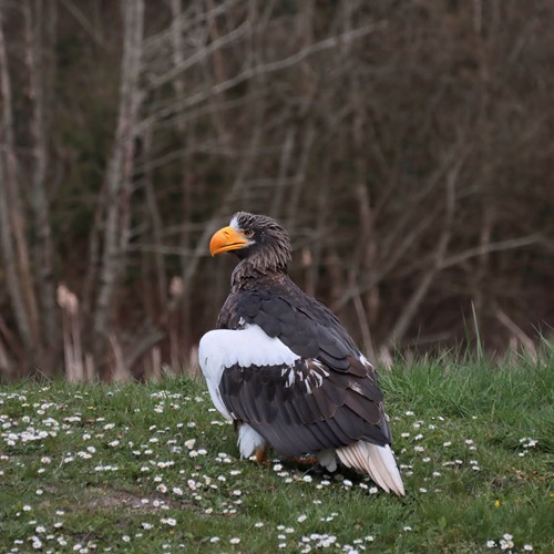 Stellers havørnen Kamtjatka er netop landet på Ørnehøjen, det centrale punkt i Ørnereservatet. Højen ligger præcist i sigtelinjen fra tribunerne og er tænkt som netop dét: et sted hvor publikum og rovfugl kan mødes i øjenhøjde – uden filter, uden afstand.