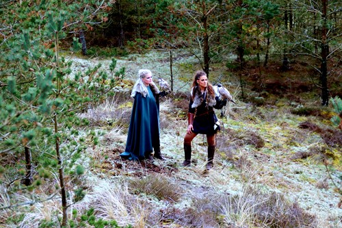 Du kan på Ørnereservatet se en gengivelse af, hvordan en falkejagt med stolte vikingekvinder kunne have set ud. Modellerne på billedet hedder – selvfølgelig – Sif og Frigg efter Thor og Odins hustruer. Billedet er en del af en større udstilling om falkejagt i kulturhistorisk kontekst.