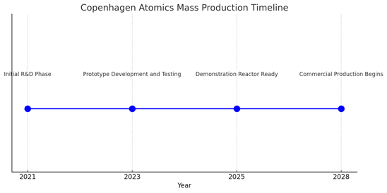 Ifølge planerne hos Copenhagen Atomics forventes deres første kommercielle thorium-baserede SMR'er at være klar til masseproduktion og salg allerede i 2028. Disse kompakte reaktorer vil kunne masseproduceres og levere omkostningseffektiv og grøn energi på stor skala til mange lande verden over. Virksomheden sigter ambitiøst mod at kunne producere reaktorerne til en lav omkostning på under 48 dollar per megawatt-time, hvilket vil gøre teknologien yderst konkurrencedygtig.