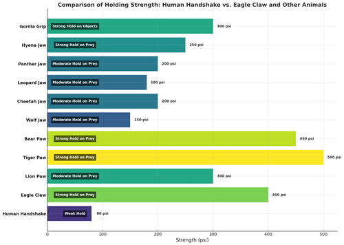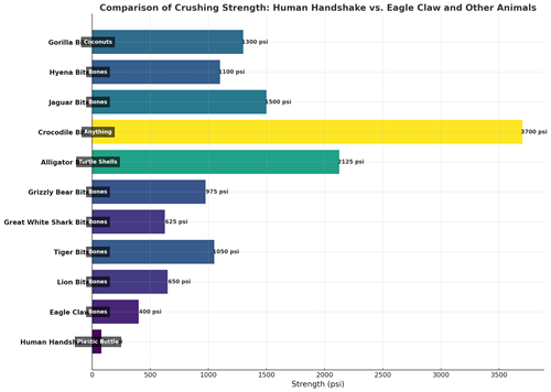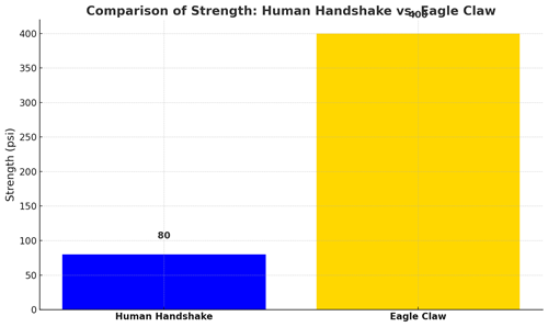 Her er en grafisk sammenligning af styrken (i psi) og hvad de kan knuse for 10 dyr i samme størrelse som en ørn, sammen med menneskets håndtryk og en ørns klo: