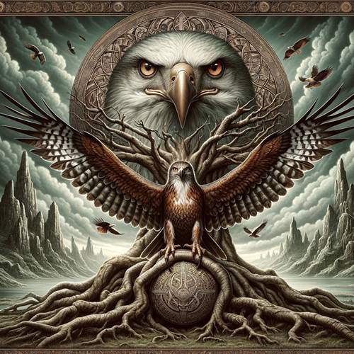 I nordisk mytologi sidder en mægtig ørn i toppen af verdenstræet Yggdrasil. Under dens vinger bor en høg ved navn Veðrfölnir, som giver ekstra skarphed til ørnens syn. Denne ørn symboliserer visdom og overblik over de ni verdener, som Yggdrasil forbinder. Dualiteten mellem ørnen i træets top og dragen Nidhug ved rødderne symboliserer konflikten mellem himmel og jord.