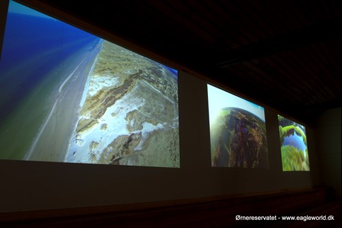Udover infohulerne vises der på store fladskærme og med projektorer, optagelser fra droner der hjælper os til at forstå fuglenes foretrukne flyveruter, deres måde at afsøge terrænet for føde på, og generelt få fornemmelsen af hvad det vil sige at som en rovfugl opleve verden ovenfra.