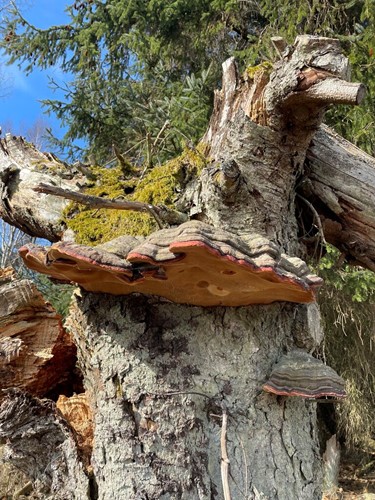 Det her sted var noget helt særligt. Ikke kun for ørnen, men for en lang række arter, der trives i stilheden. Og så fik vi øje på den: En enorm, randbæltet hovporesvamp, der målte hele 70 centimeter. Et imponerende syn, som vidner om årtiers uforstyrret vækst.