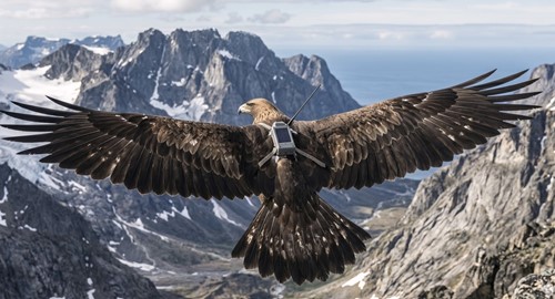 Det er et mærkeligt syn. En kongeørn svæver elegant over bjergene. Vingerne er spændt ud i den perfekte balance, som evolutionen har formet gennem millioner af år. Og så – midt i al den naturlige perfektion – sidder der en lille kasse på ryggen. En antenne stikker ud, og en sele holder det hele på plads. Det ligner ikke fremtiden; det ligner noget, vi burde være færdige med.