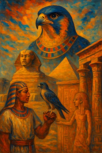 Et særligt aspekt, som har fået fornyet interesse i forskningsverdenen, er egypternes forhold til rovfugle – især falken. Guden Horus afbildes traditionelt som en falk eller en mand med falkens hoved. Han symboliserede kongemagten og himlens overblik.