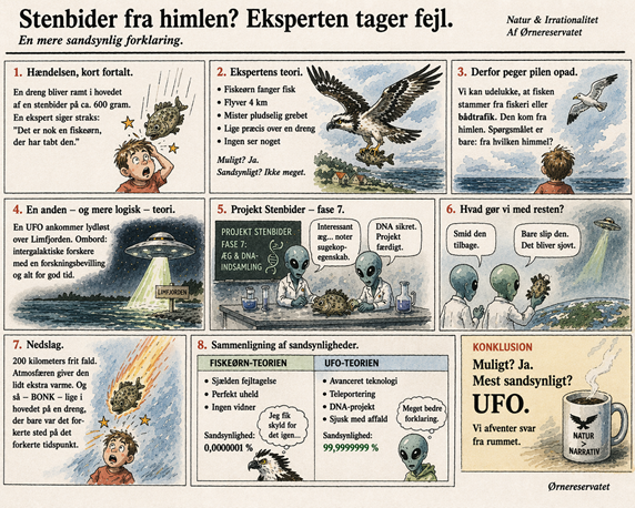 Der findes en særlig form for moderne mytologi, som trives bedst i det flade danske landskab, hvor horisonten er vid, og dramatikken normalt begrænser sig til forsinkelser hos DSB. For nylig faldt en stenbider på 600 gram ned fra himlen ved Limfjorden og ramte en sagesløs dreng i hovedet. Det er en begivenhed, der i tidligere århundreder ville være blevet udlagt som et varsel om kongemord eller forestående hungersnød. I 2026 blev det i stedet til en mediehistorie om den ædle fiskeørn.